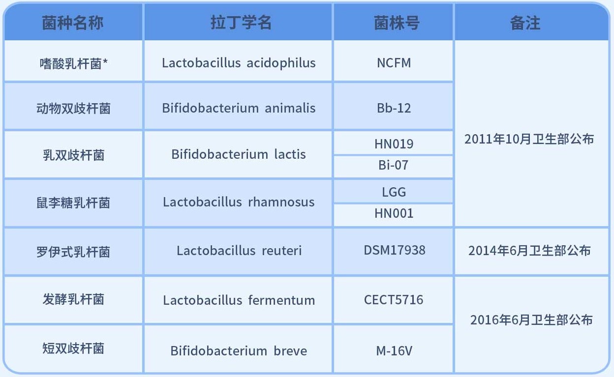 根据国家卫生部的公告,可用于婴幼儿配方食品中的菌种名单